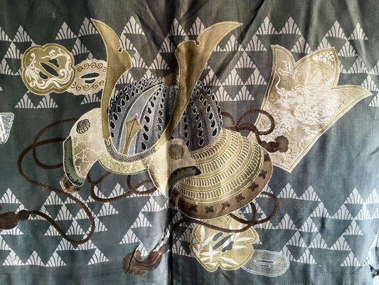 Haori japonais antique homme soie noire Montsuki Casque samourai Kabuto