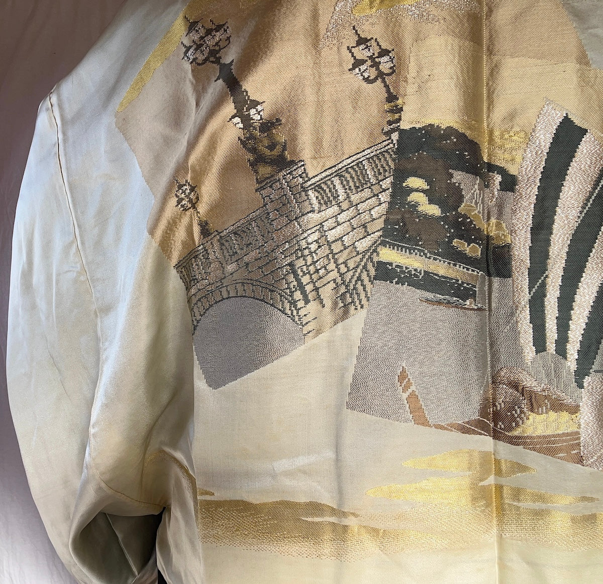 Ce haori formel en soie noire pour homme est orné de cinq kamon (blasons familiaux) Maru ni Futatsu Hiki Mon – 丸に二つ引両, symbole du plus haut niveau de formalité dans le vêtement traditionnel japonais. L’intérieur révèle une exceptionnelle doublure haura en soie au style Art Déco, représentant un voilier japonais longeant la côte ainsi qu’un pont de pierre d’inspiration européenne – une rencontre symbolique entre le Japon et l’Occident qui caractérise l’esprit moderne de l’ère Shōwa.
